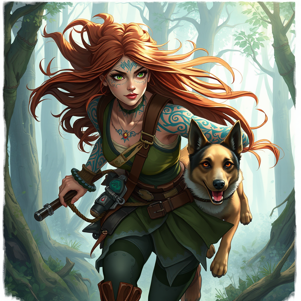 A huntress dashing through a mystical forest alongside her faithful dog, her flowing brown hair catching the breeze as she moves with agility and grace. Her face is adorned with intricate blue tattoos that speak of ancient myths, and she wears a blend of green and brown attire that allows her to blend seamlessly with her surroundings. This detailed illustration captures her in full, a testament to the artistry and imagination of digital art. She stands as a character concept, brought to life with the touch of inspiration from talented artists like Dan Mumford, Peter Mohrbacher, and Greg Rutkowski. Her long hair cascades down her back, while her focused expression reveals her determination and skill. Beautifully over-detailed, this fantasy character is envisioned in crystal-clear HD and 4k quality, designed to captivate and intrigue, a creation worthy of attention on platforms like ArtStation.