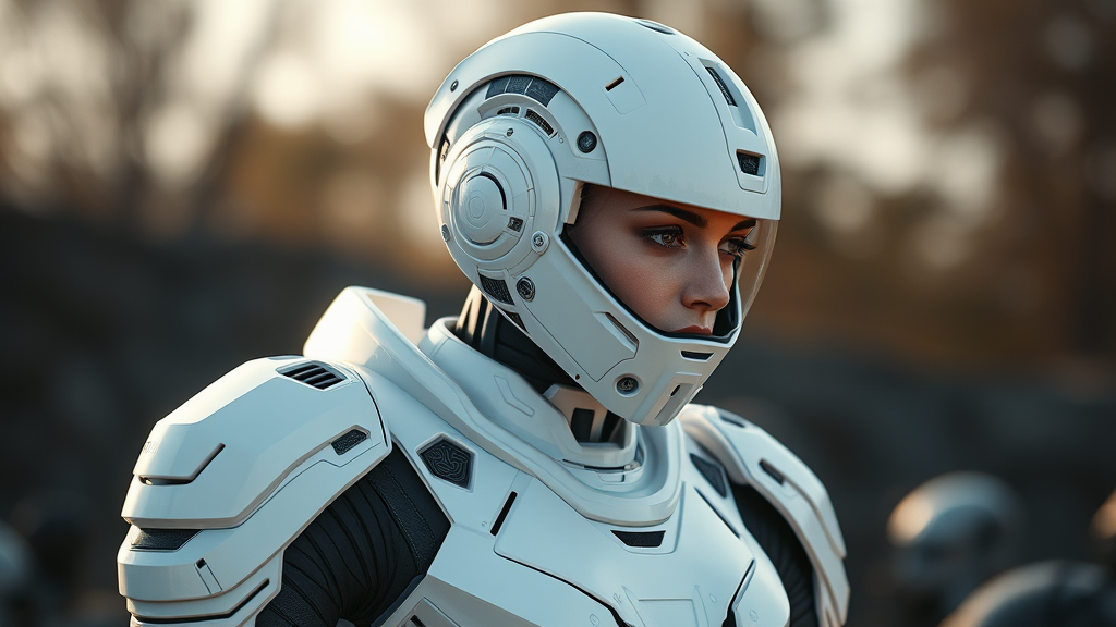 Sleek white sci-fi female armor with intricate cybernetic helmet, complete with full body armor design and insulated features, resembling a sophisticated spacesuit. The character has a bald head, showcasing meticulous detail, reminiscent of a high-budget sci-fi movie style. Captured in an outdoor setting, the photograph utilizes natural light to highlight the armor's photorealistic finish. Cinematic rendering and advanced ray tracing techniques create the highest quality and detail in 8K Ultra-HD. The scene is portrayed from a third-person perspective, incorporating a subtle blur effect and long exposure to enhance depth and mood with cinematic and moody lighting.
