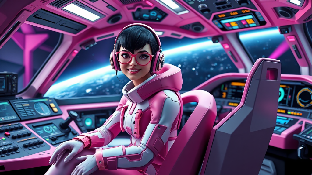 A full-body 3D render of a female dark space explorer with very short black hair, seated in her expansive ship cockpit. She is surrounded by an intricate array of cockpit controls with a vast view of the dark space outside the window. She wears a futuristic pink and white sci-fi outfit, and her face is adorned with a friendly smile. The explorer sits in a sleek pink chair, wearing a matching pink headset. Her glasses reflect the ambient neon lights of the cockpit. While the render captures her essence accurately, subtle elements of mutation, like slightly longer fingers, add an eerie uniqueness to her appearance. The striking image conveys a sense of adventure and exploration, despite slight imperfections that lend an otherworldly touch. The composition maintains focus on the explorer and omits extraneous or distracting elements such as watermarks or text.
