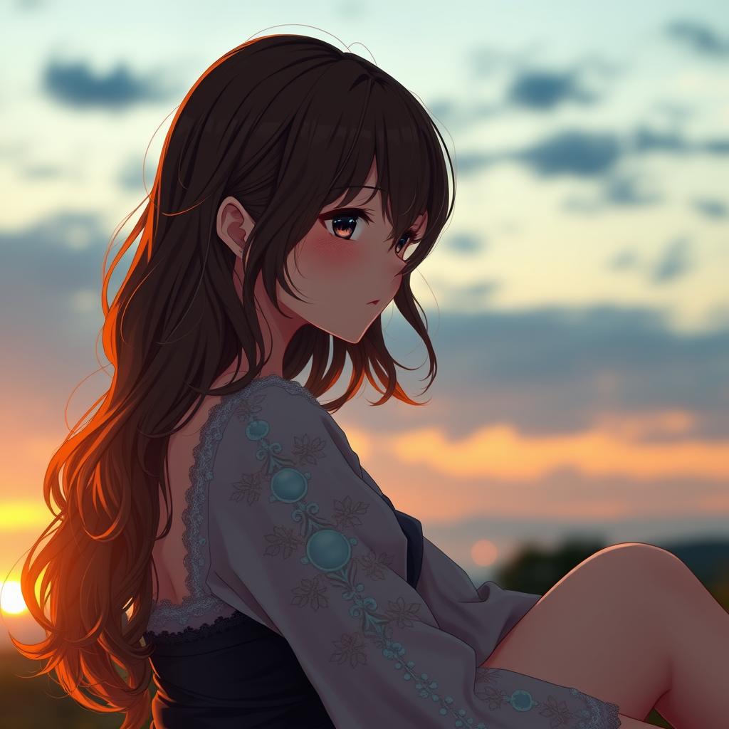 A beautifully detailed and cinematic portrait of an anime girl with wavy medium-length brown hair, showcasing her stunning and graceful figure. She is sitting elegantly at sunset, around 8:30 pm, against a breathtaking sky. The scene is captured in hyperrealistic style, with full-body focus and intricate clothing that highlights her form. Sharp detail is emphasized with cinematic lighting at an f/1.8 aperture using an 85mm lens, adding depth and focus to the image. The presence of atmospheric elements like volumetric fog creates a dreamlike quality, and the piece is presented in high dynamic range, capturing vibrant colors in 4K or 8K resolution. The gentle blush on her cheeks adds a touch of realism, while the background subtly blurs, drawing attention to her captivating presence.