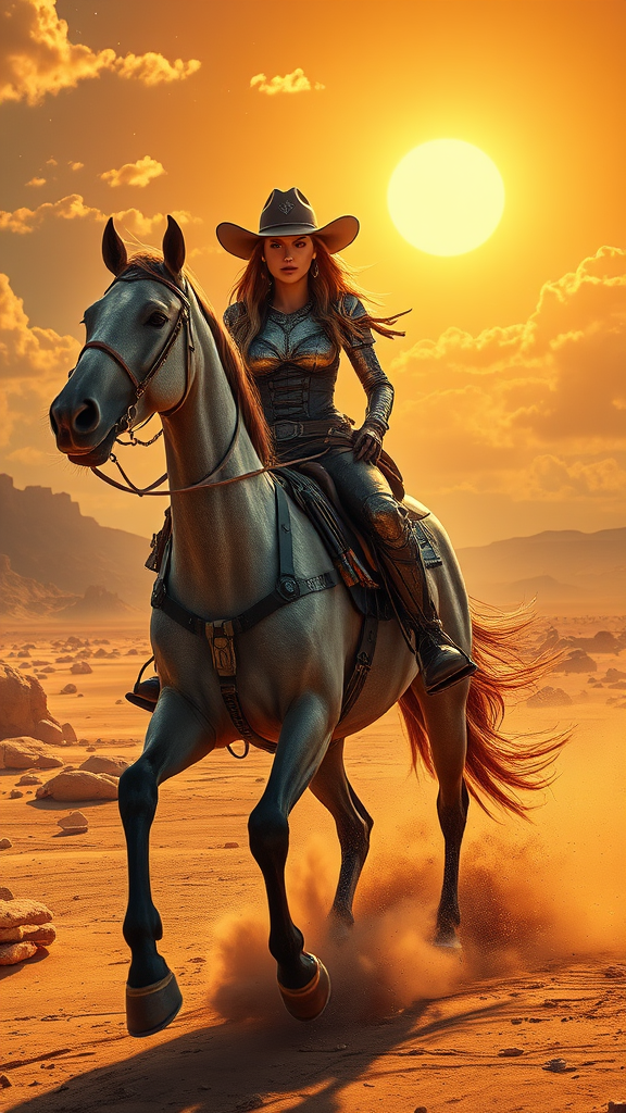 In the expansive landscape of a distant galaxy, a strikingly beautiful space cowgirl commands attention as she confidently rides a sleek, genetically-enhanced horse. The fusion of wild west and sci-fi elements is seamlessly integrated into her futuristic attire, adorned with shimmering metals and intricate designs that catch the ethereal light of distant stars. Her eyes, sharp and determined, reflect the untamed spirit of the cosmos. Around her waist, an intricate belt holds advanced gadgets and a sleek laser pistol, adding a modern twist to her rugged ensemble. As the horse gallops across a terrain that blends rocky mesas with futuristic elements, the dust dances beneath their hooves, creating a mesmerizing spectacle. Bathed in the golden glow of a setting sun that pierces through alien clouds, the scene is captured in ultra-detailed realism, evoking the breathtaking allure of this space age era.