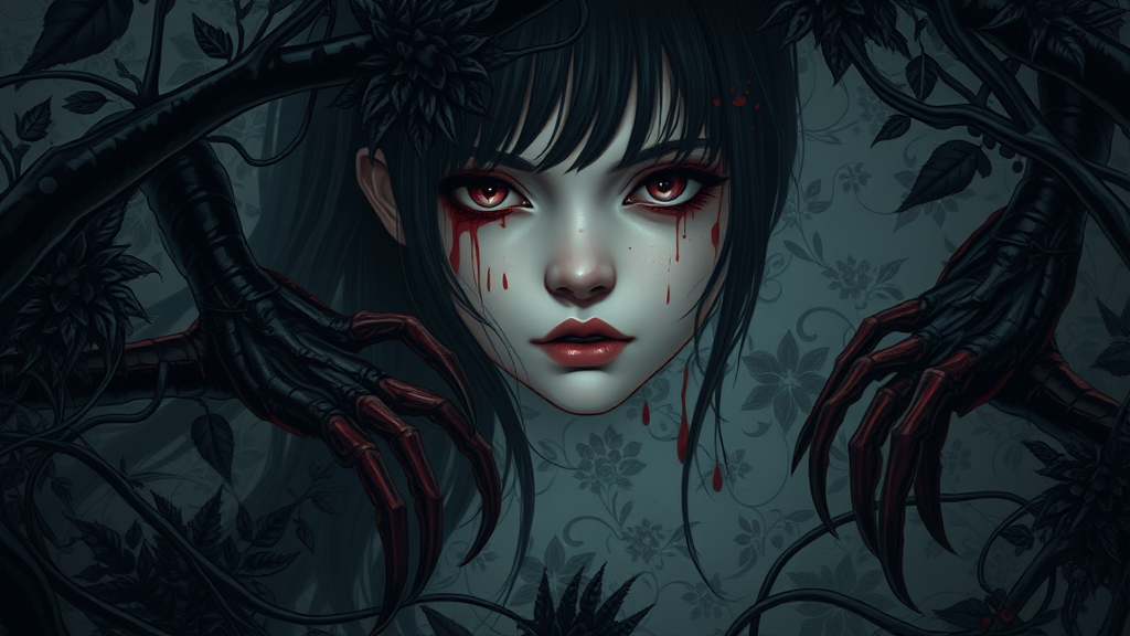 A girl's face emerges from a gloomy landscape, framed by predatory plants with sprawling legs and black veins. Oil drips from the foliage, creating an eerie, slick texture. Ivy weaves through the scene, accentuating the sinister elegance. Her expression is enigmatic, highlighted with red splashes and undertones that reflect a sense of hidden intensity. The background is adorned with a floral pattern, intricate and shadowy, creating a haunting contrast. The illustration exudes fine art quality, rendered in 8K resolution. Rim lighting enhances the contours, while artificial lighting casts an otherworldly glow, enveloping the scene in an unsettling beauty.