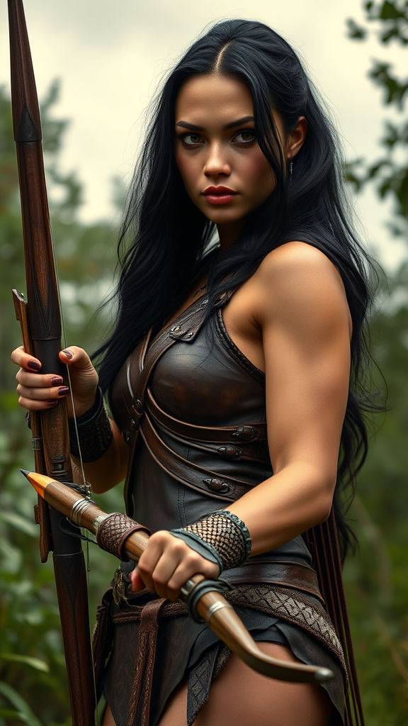 A stunning Amazon warrior stands poised in the lush woodland, gripping a beautifully crafted bow and arrow. Her long, silky black hair cascades down her back, accentuating her fair, light complexion and mesmerizing hazel brown eyes. Possessing symmetrical, angelic features, her face is perfectly proportioned, as is her athletic physique. She is clad in exquisite, intricately detailed leather armor that highlights her graceful form. The waist-length body shot captures the fine detailing of her attire and weaponry. Rendered with ultra-realistic and highly detailed quality, the scene benefits from cinematic photography lighting under an overcast sky. The image features reflection mapping, photorealistic textures, and is movie quality, achieved through advanced rendering techniques such as octane rendering and RTX ray tracing. With a focused 8K resolution, depth of field, and authentic shadows, a hint of cinematic noise and subtle VFX post-production enhance the atmosphere, offering a captivating and immersive visual experience.