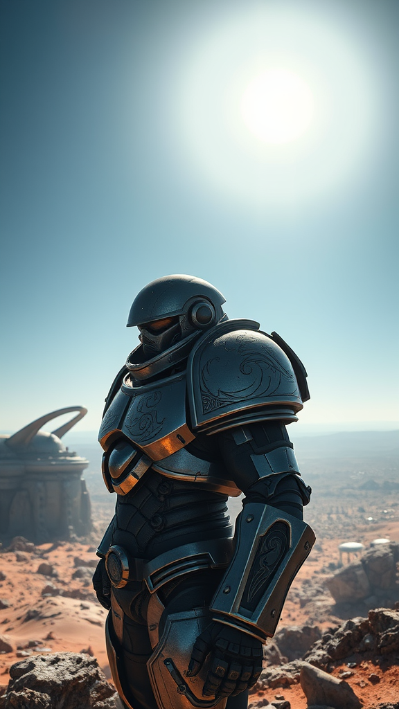A lone space marine stands under the bright midday sun, their armor reflecting the intense light. The figure's features are chiseled and imposing, blending H. R. Giger's biomechanical aesthetic with an air of Rembrandt's masterful use of oil painting. Dark, intricate designs weave across the armor, while bold shadows play across the marine’s face, revealing a contemplative gaze. The background is a surreal landscape, merging alien structures with the grandeur of a cosmic horizon, adding depth and mystery to the scene.