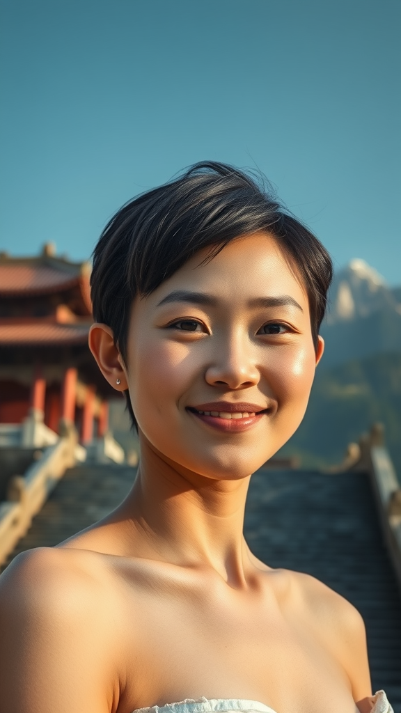 ganyudef upper body smile subtle blush outdoors daytime minimalist background clear blue sky short hair ancient temple looking directly at viewer stone stairs majestic mountain soft moody lighting high resolution UHD vivid colors natural scenery serene atmosphere harmonious composition balanced aesthetics realistic proportions detailed craftsmanship gentle expression inviting gaze