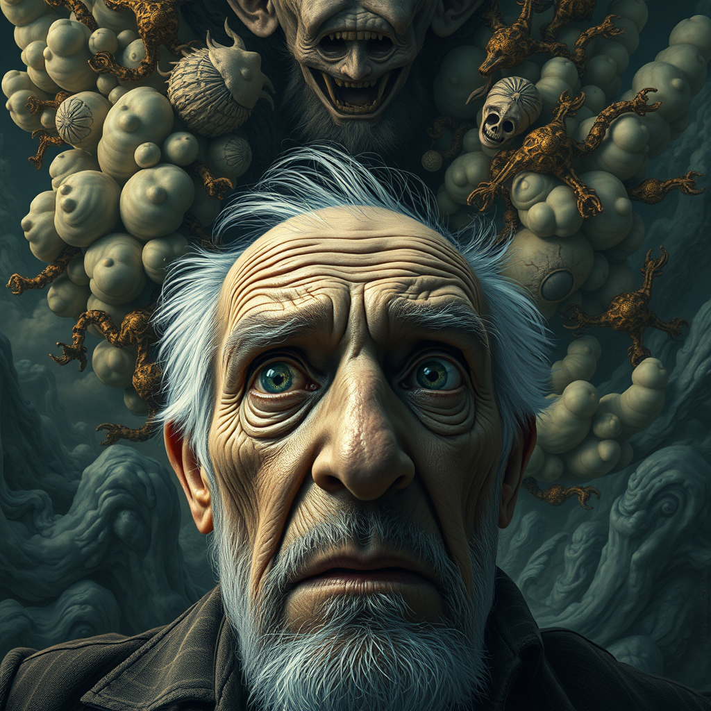 Elderly man with a look of sheer terror in his eyes, beneath a chaotic and surreal sky reminiscent of Mundford's imagination, baroque maximalist influences, with a touch of chibi style inspired by Artificial Nightmares, the artistic strokes of Stanley Artgerm, and the dark whimsical flair of Tim Burton. His face possesses striking features, with sharp, expressive eyes that convey deep fear. The image is ultra-photorealistic with intricate details, capturing the organic, dynamic essence of the scene in high-definition, with a crisp, detailed quality that brings the frightening vision to life.
