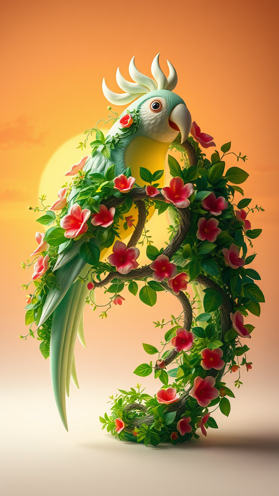 A whimsical, abstract 3D structure resembling a parrot, intricately entwined with lush, green foliage and vibrant flowers, emits a soft, ethereal glow against a warm, sunset-hued backdrop.