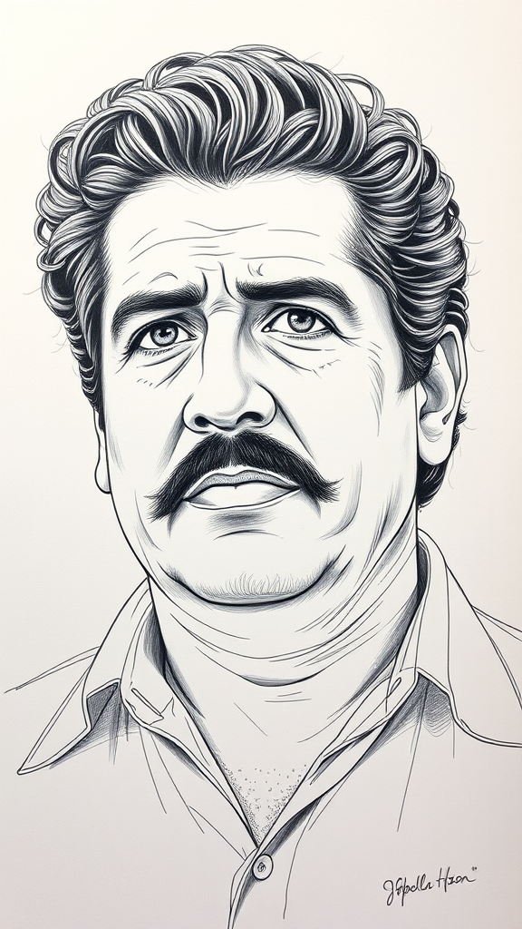 A portrait of Pablo Escobar sketch drawn on paper, intricately detailed and centered, with breathtaking beauty and precise line art. It displays a vibrant and comprehensive cinematic style inspired by Charles Dana Gibson, with 8k and HDR quality, elements reminiscent of Vice City aesthetics. The image includes a mosaic of errors with missing and extra digits, cropped elements, and jpeg artifacts. There are unique and unconventional takes on anatomy with extra limbs and distorted features. Despite being imperfect, the artwork retains a captivating allure amidst blurred and fuzzy lines, with a watermark and artist signature subtly visible, adding an enigmatic quality alongside elements of intentional distortion and abstract deformation.