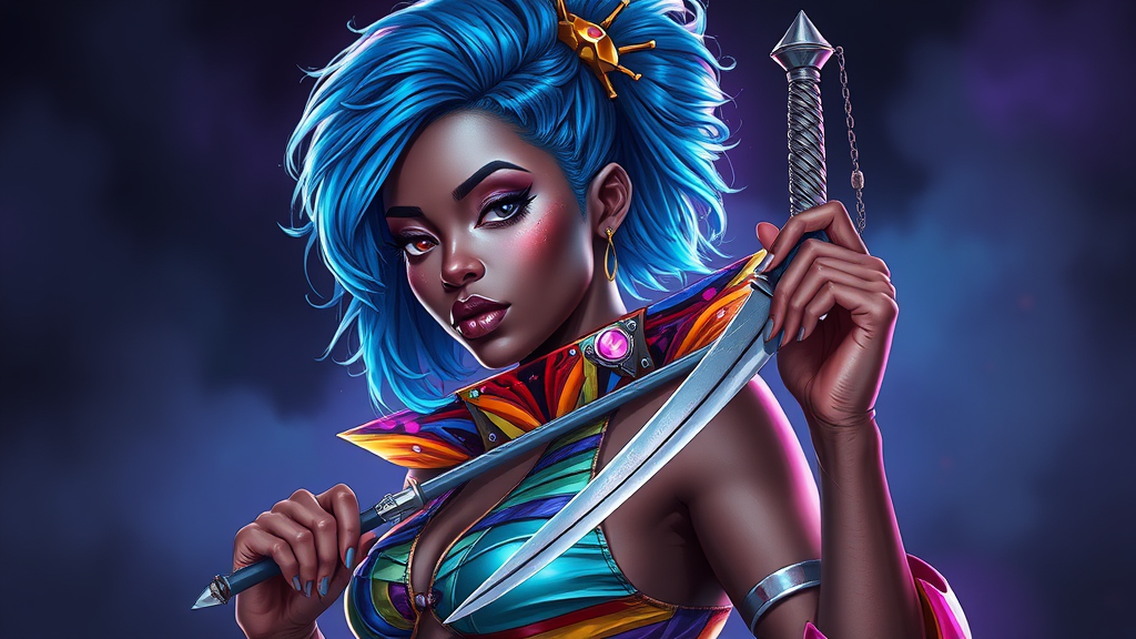 A stunning Afro-futuristic woman with electric blue hair, wearing a kaleidoscope of colors in her outfit, confidently holding a dagger; with inspiration from Rossdraws, the artwork showcases vivid, realistic hues that burst with life, embodying a blend of vibrant, colorful digital painting and concept art. The scene is infused with dark, vibrant colors and a touch of pastel vibrancy. This beautiful digital artwork exudes a hyper-realistic quality, seamlessly blending an enchanting art style with strikingly gorgeous details, reminiscent of vibrant fan art.