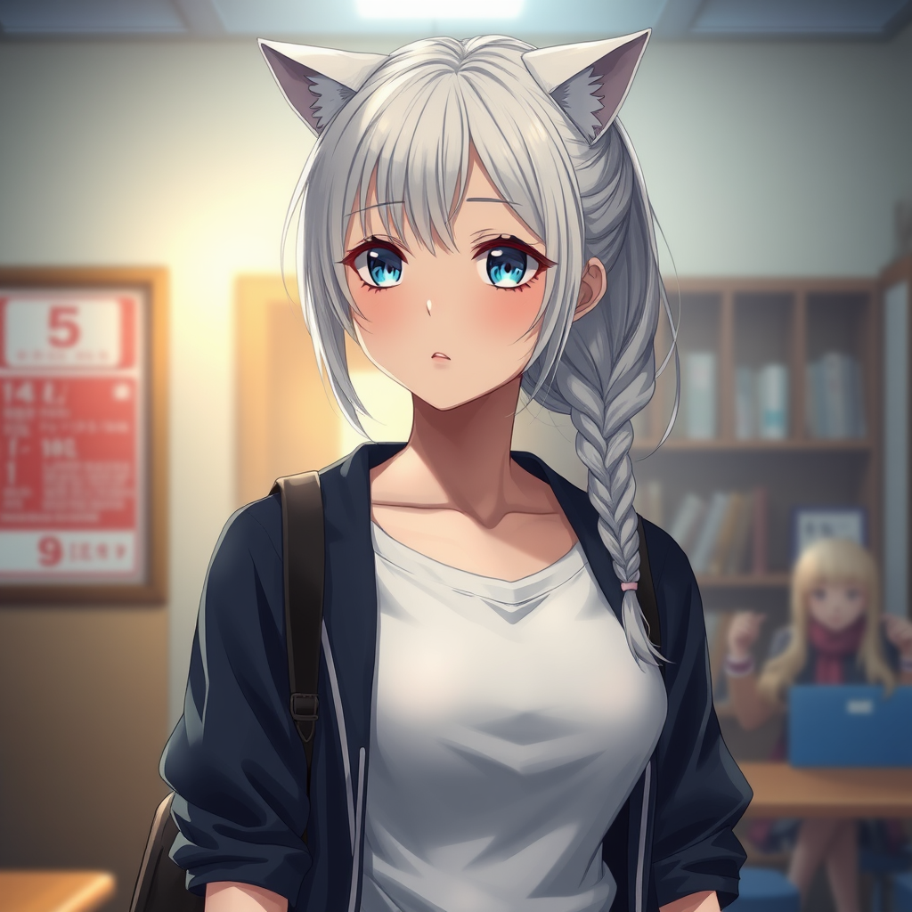 Solo anime girl full body young adult medium chest hyperdetailed school background school medium white hair braid cat ears beautiful blue eyes side view waist-up shot thick lineart anxious hyperdetailed natural light reflection volumetric lighting maximalist photo illustration high resolution intricately detailed vibrant panoramic cinematic masterfully crafted stunning ultra detailed expressive colorful rich deep color vintage show promotional glamour anime art fantasy art brush strokes digital art glow effects hand drawn sharp focus hyperrealistic vivid colors modelshoot style professional majestic oil painting by Ed Blinkey Atey Ghailan Studio Ghibli by Jeremy Mann Greg Manchess Antonio Moro trending on ArtStation dramatic photorealistic painting high detail