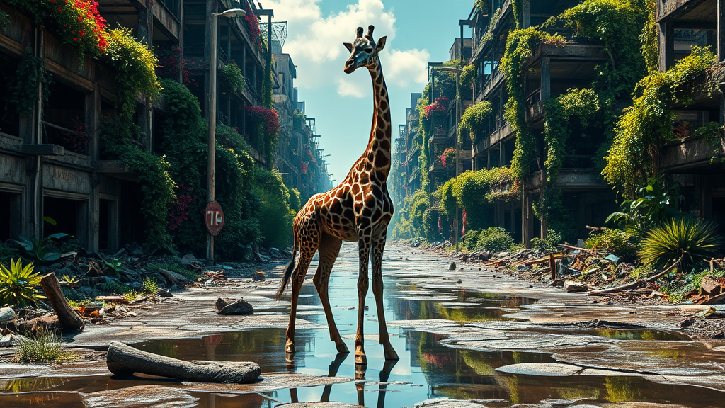 A stunning giraffe with a blue, slightly disfigured head stands gracefully amidst a vibrant, dystopian post-apocalyptic city teeming with lush vegetation. The scene is bathed in cinematic lighting, casting dramatic shadows across the realistic, highly detailed ruins. Reflective puddles speckle the cracked streets, mirroring the rich tapestry of overgrowth climbing the skeletal structures. It's a bright, sunny day, the light filtering through the foliage casting an ethereal glow, captured in exquisite 8k detail, reminiscent of an octane render. The city around, a colorful but haunting reminder of a world reclaimed by nature, complements the giraffe's presence, a symbol of resilience and adaptation.