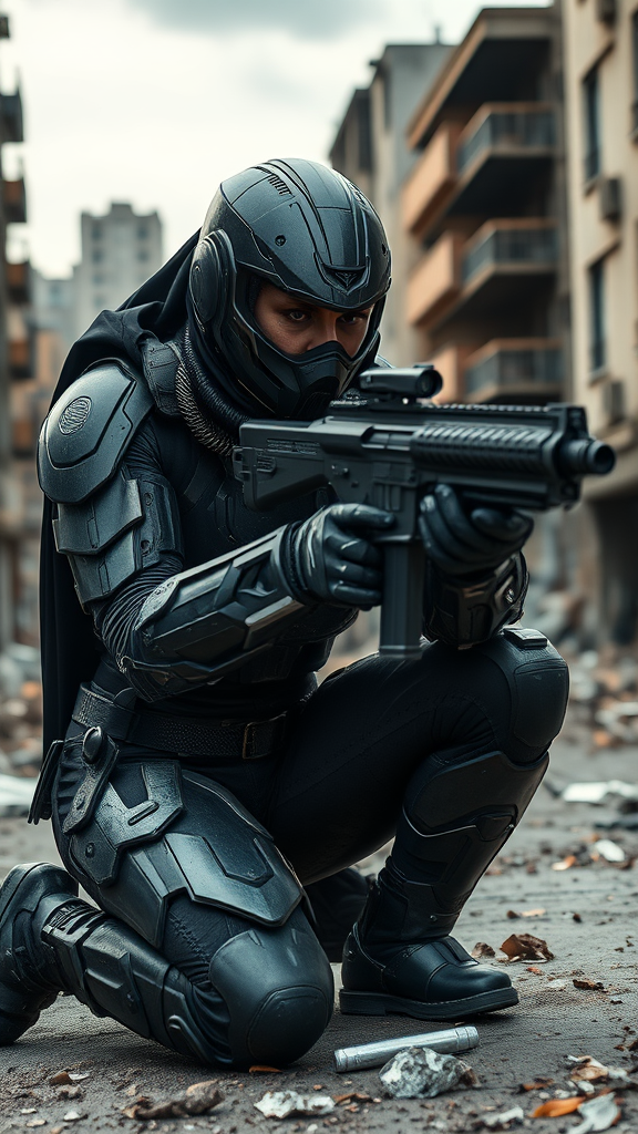 A powerful, black female warrior clad in futuristic battle armor kneels intently amid a devastated urban landscape. Her sleek, cybernetic helmet integrates seamlessly with a high-tech sci-fi visor, framing her keen eyes. A gleaming mask covers the lower half of her bald head, adding an air of mystery. With precision, she aims a sophisticated weapon, her plate and insulated armor gleaming with intricate designs and reflecting the gritty textures of the ruined city street. The atmosphere is thick with tension under an overcast sky, and the scene captures the essence of a sci-fi epic with natural textures and lighting. In a photorealistic, ultra-HD resolution, the cinematic quality is heightened by subtle details like natural blur and moody lighting, resembling a still from a high-caliber sci-fi film. The scene is viewed from a third-person perspective, utilizing long exposure and ray tracing to amplify the realism, providing a vivid snapshot that echoes with intensity, rendered in 8K for maximum impact.