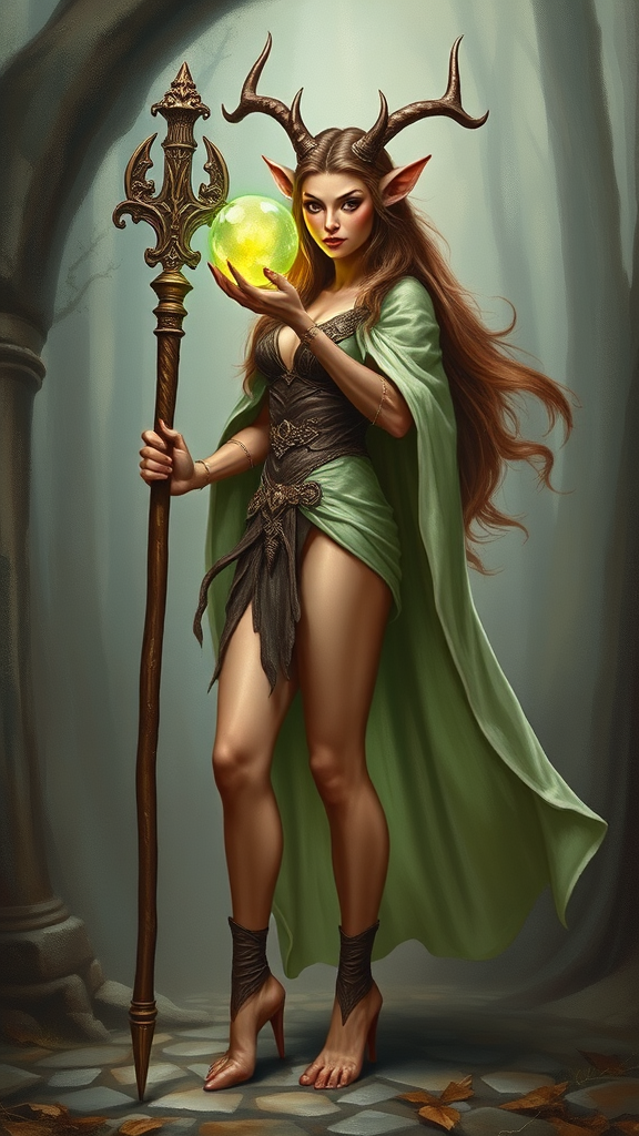 A beautiful oil painting of a standing female faun with long, flowing brown hair and cloven hooves, her legs adorned with elegant deer fur, embodying the essence of a Satyr, a fantasy cleric character. She wears a light green cloak that drapes gracefully around her, holding a wooden staff crowned with a luminous green orb. The setting is a panned out view, rich with elements of mythology and high fantasy. The painting is exquisitely detailed, capturing a 16k resolution with UHD and HDR quality, inviting viewers into an UnrealisticDream world that balances wondrous fantasy with an intriguing sense of mystery.