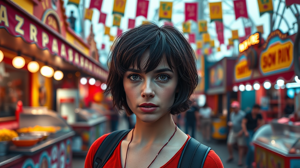 A stunning portrait of Daisy Ridley at a lively amusement park, where she's caught looking directly at the camera with her short dark hair slightly tousled. The vivid scene features bustling merchant stalls offering food and souvenirs, and bright, colorful banners strung above wide pathways. The photograph exhibits sharp focus and professional portrait quality, reminiscent of award-winning photographers like WLOP and Jeffrey Simpson, with dramatic lighting enhancing the ambiance. The composition uses depth of field to emphasize Daisy's expression amidst the vibrant backdrop, capturing her with an unexpectedly intense and contemplative gaze. This image, with its artistic flair and illustration-like quality, subtly incorporates an air of fantasy, akin to a painting by Gregory Rutkowski. Despite the vibrant setting, there is a monochrome-esque tone cleverly integrated to add a timeless quality, with careful attention to shading and stylization.