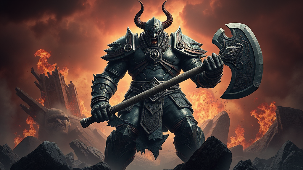 Capture Worldbreaker Sion in a hyper-realistic photograph set amidst a chaotic and apocalyptic landscape, showcasing his massive towering physique, intricate armor, and signature axe using advanced lighting techniques and dynamic posing; highlight the details of his fierce unrelenting expression to convey power and destruction, employing a muted desaturated color palette with pops of dark crimson and obsidian black to encapsulate Worldbreaker Sion's catastrophic world-ending essence, adding subtle creative modifications while preserving the core concept.