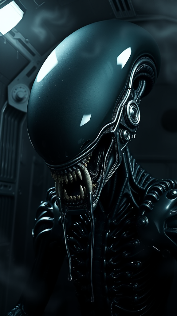 A highly detailed portrait of an alien creature inspired by the Xenomorph from the Alien movies. The creature possesses a sleek, elongated head with a smooth, dome-like surface, full and devoid of visible eyes, creating an eerie and unsettling appearance. Its mouth reveals short, razor-sharp metallic teeth, with a second smaller set of teeth extending from within, reminiscent of a small black box with sharp edges emerging. Its skin is a glossy, obsidian-like exoskeleton reflecting light in a sinister manner, adorned with biomechanical ridges and tubes running along the head and neck. The backdrop features a dim, industrial setting with metallic walls, sporadic water drips, and tendrils of steam, enhancing the creature's menacing aura. Deep shadows are cast across the alien's visage due to strategic lighting, accentuating its terrifying, otherworldly essence. The alien resides within a shadowy spaceship, enveloped by steam and dripping moisture, fortifying its menacing presence.