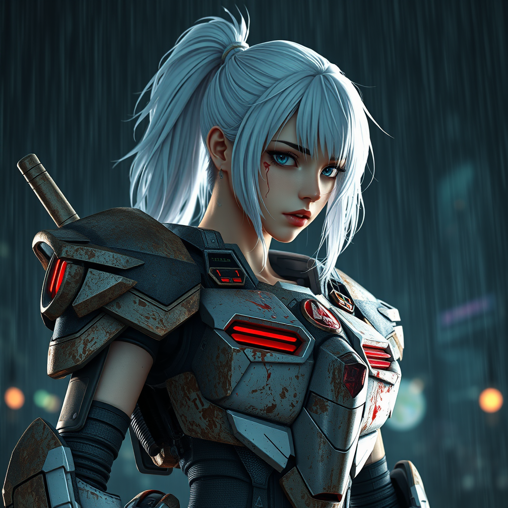 A young woman in battle-worn Gundam armor stands strong on a dark, rainy night. Her white hair, slick with rain, is tied back in a ponytail, highlighting her determined expression. The scene captures the climax of an epic fight; she's wounded, adding to the drama and intensity. The art style echoes the gritty yet vibrant aesthetic of Borderlands, featuring extreme details in a cinematic masterpiece admired on ArtStation. The photograph-like quality showcases a stunning, surreal environment, with smooth, shiny surfaces reflecting divine and celestial tones akin to manga and anime atmospheres. The scene brims with intricate details, rich colors, and cinematic lighting, creating a hyper-realistic focus reminiscent of Unreal Engine 5's cutting-edge CGI, enhanced by Lumen reflections and rendered in Octane 3D. Despite its artistic brilliance, the piece intentionally incorporates anomalies like low resolution, text errors, and cropping, challenging the viewer with elements of imperfection amidst an otherwise captivating representation.