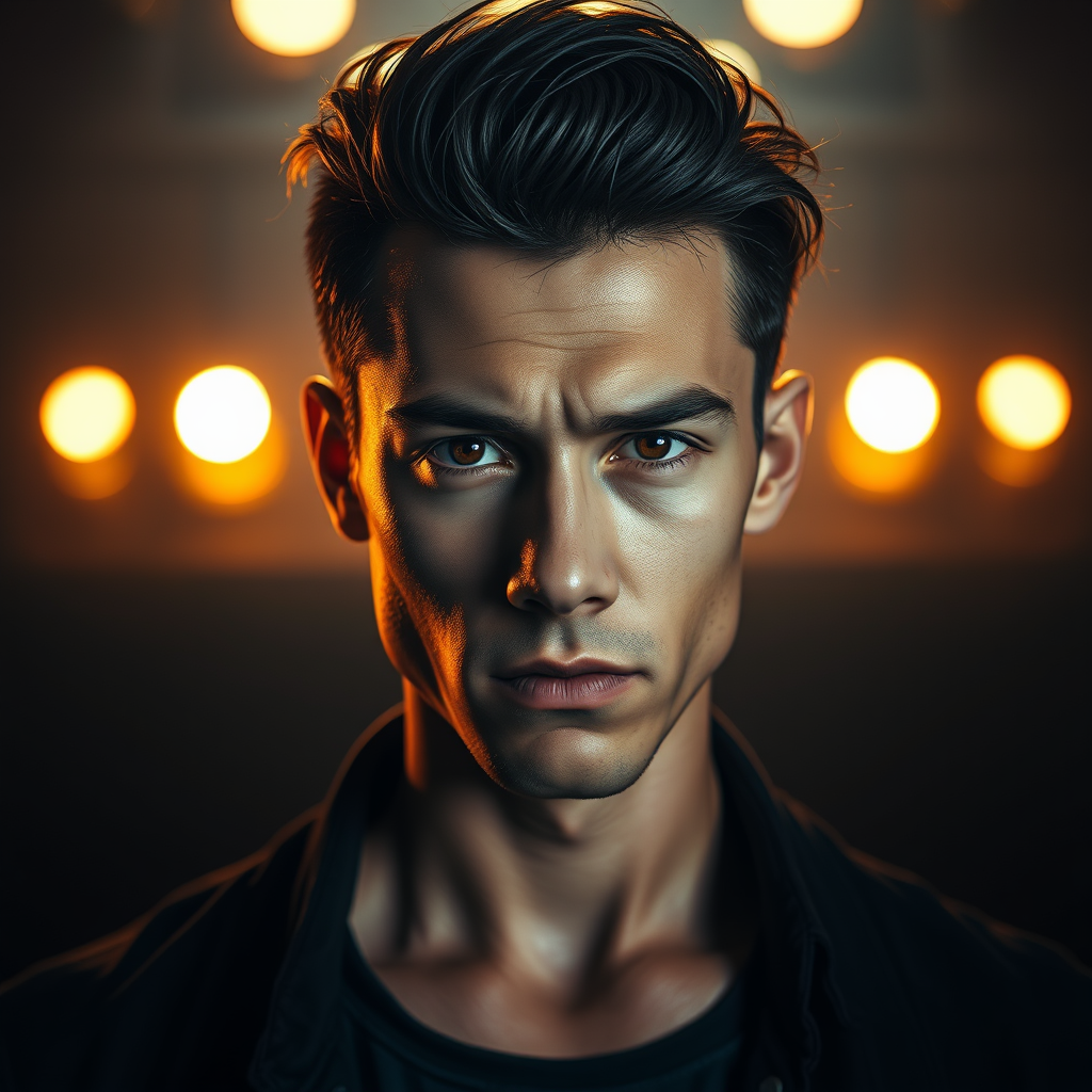 A captivating three-quarter close-up portrait of a 30-year-old man with a slender athletic build and a striking face. His expression combines a frown with innocence, and his hair is styled with precision. The background is oppressive and contrasting, adding intensity with its dramatic and expressive elements. Backlighting from within heightens the atmosphere, creating a gloomy horror-inspired setting. The image is captured in a cinematic style from a low angle using a DSLR camera with an aperture of f/7, shutter speed of 1/100 sec, and ISO 150. The photograph is hyper-realistic with intricate details and natural reflections, featuring cinematic anime lighting. There is a play of bright, almost blinding, lights with hints of symmetry and texture. The composition ensures clarity and focus, avoiding any distortions or anomalies in anatomy, maintaining a natural and proportionate portrayal. The result is a polished, high-quality, and immersive portrait.