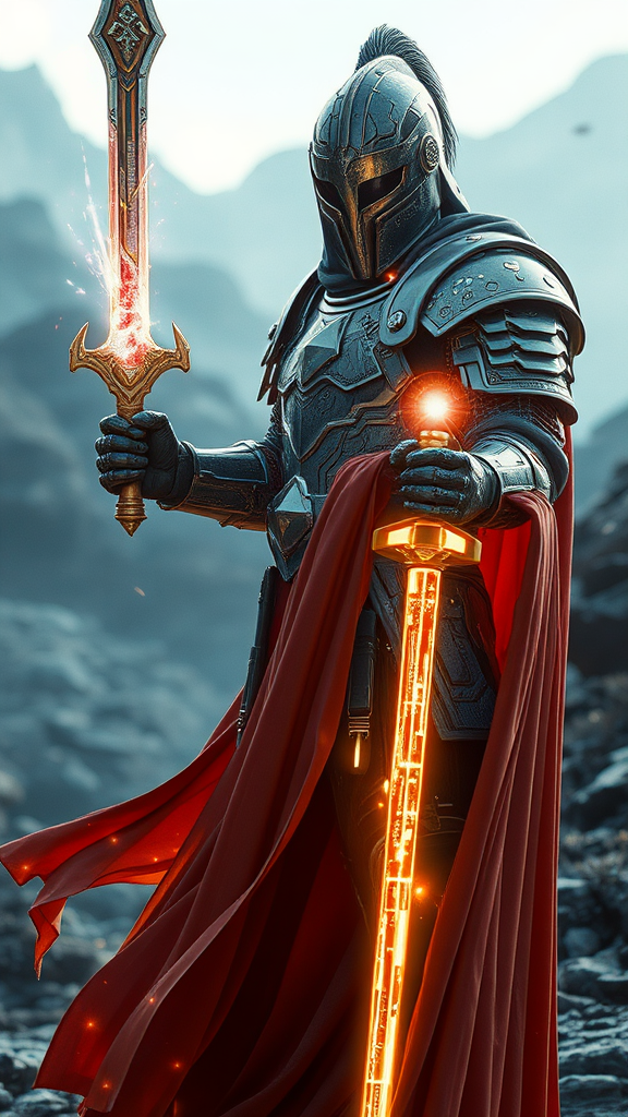A futuristic medieval knight adorned in intricate cybernetic armor and flowing, elegant robes that shimmer with embedded circuitry, wielding a luminous, ethereal weapon that pulses with energy; set against a sci-fi landscape with dynamic lighting, focusing on photorealistic details and a cinematic atmosphere, capturing the fusion of ancient nobility and advanced technology.
