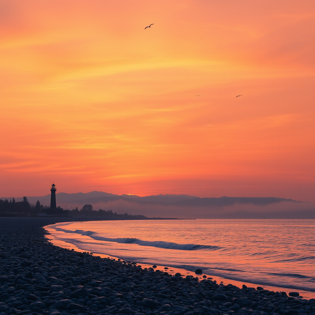 A sprawling sunset landscape under a vast, open sky with hues of orange, pink, and purple blending seamlessly, gentle waves lapping at a secluded shoreline dotted with smooth pebbles, a solitary lighthouse standing proudly at the edge, silhouetted against the horizon, distant mountains framed softly in mist, a flock of birds soaring lazily above, ancient trees whispering secrets to the wind, tranquil and serene, capturing the essence of nature's quiet majesty at the golden hour, a scene both timeless and ephemeral.