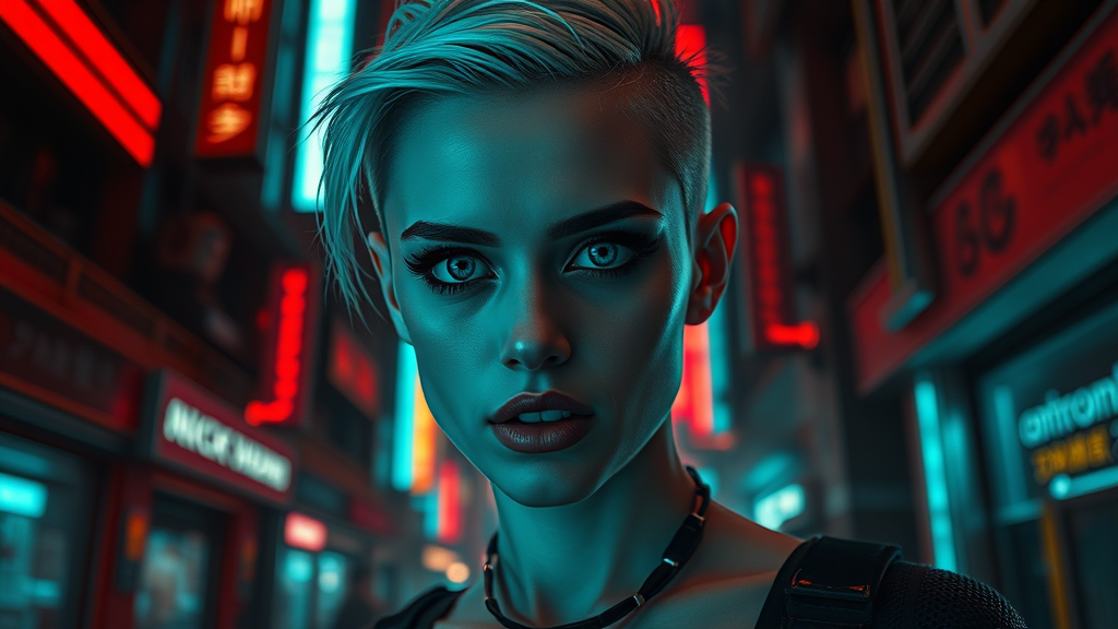 A stunning pale cyberpunk woman with striking blue eyes and an edgy shaved side haircut, accentuated by bold black eyeliner, stands amidst a dark red city. The scene is captured in hyper-detail, with cinematic lighting casting dramatic shadows and highlighting her features. She is surrounded by an otherworldly glow from swirling neon lights that dance like magical ribbons. Her expression is enigmatic, embodying both mystery and strength as she navigates the urban landscape, where technology and allure intertwine seamlessly.