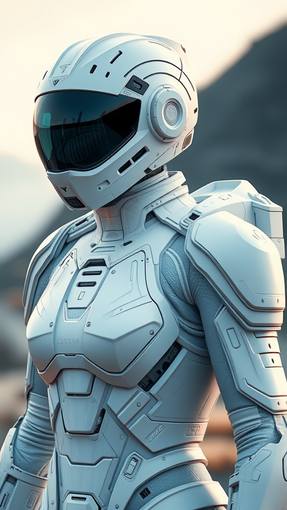 White sci-fi female armor with advanced cybernetic helmet and full-body insulated spacesuit design, featuring intricately detailed surfaces and a sleek, futuristic aesthetic. The character has a bald head, adding to the streamlined and futuristic look, reminiscent of a high-budget sci-fi movie. Captured in an outdoor setting with realistic natural light, the image features photorealism enhanced by cinematic rendering and ray tracing for lifelike shadows and reflections. The photograph is presented in a third-person view with a blur effect to suggest motion, achieved through a long exposure technique. The visual is in 8K Ultra-HD, showcasing the highest quality and detail with moody and dramatic cinematic lighting for an immersive experience, in a 9:16 aspect ratio.