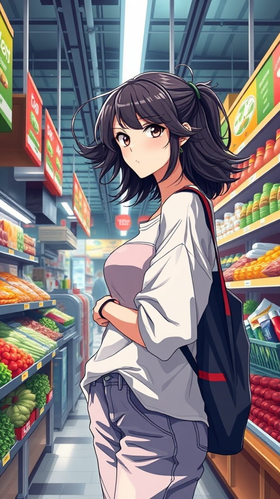 A young woman stands thoughtfully in front of a vibrant produce section, picking out her groceries in a bustling supermarket. Her stylish, urban attire reflects a modern fashion-forward sensibility, with flowing hair and a casual yet confident demeanor. The scene is depicted in a high-quality anime-style digital illustration, featuring meticulous details and dynamic colors. The artwork embodies a fusion of contemporary anime influences and the distinct styles of artists Guweiz and Bowater, with an emphasis on expressive character design and atmospheric background elements. The illustration captures the essence of daily life with an urban twist, highlighting the character's individuality as she shops amid cascading light and a colorful array of fresh fruits and vegetables.