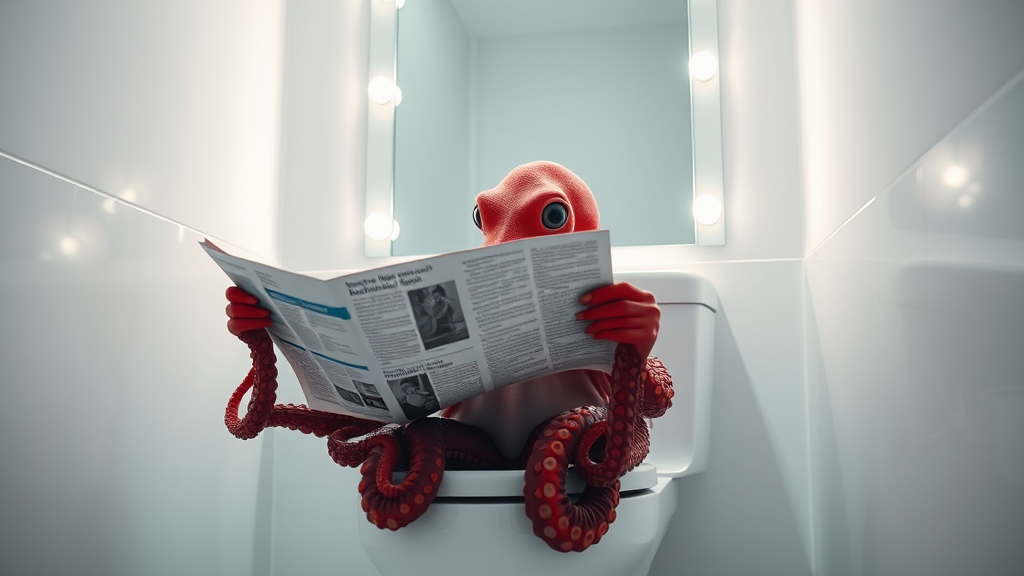 A hyper-realistic, highly detailed image of a red octopus sitting on a toilet reading a newspaper, surrounded by white tones and bright white lights. The scene features a white wall with a mirror behind the octopus, reflecting the intricate details of its skin. Soft, glowing LED lights add a cinematic touch, enhancing the luminous ambiance. The setting is devoid of dark tones, creating a crisp, clean atmosphere with the focus on the vibrant red of the octopus against the monochrome backdrop.