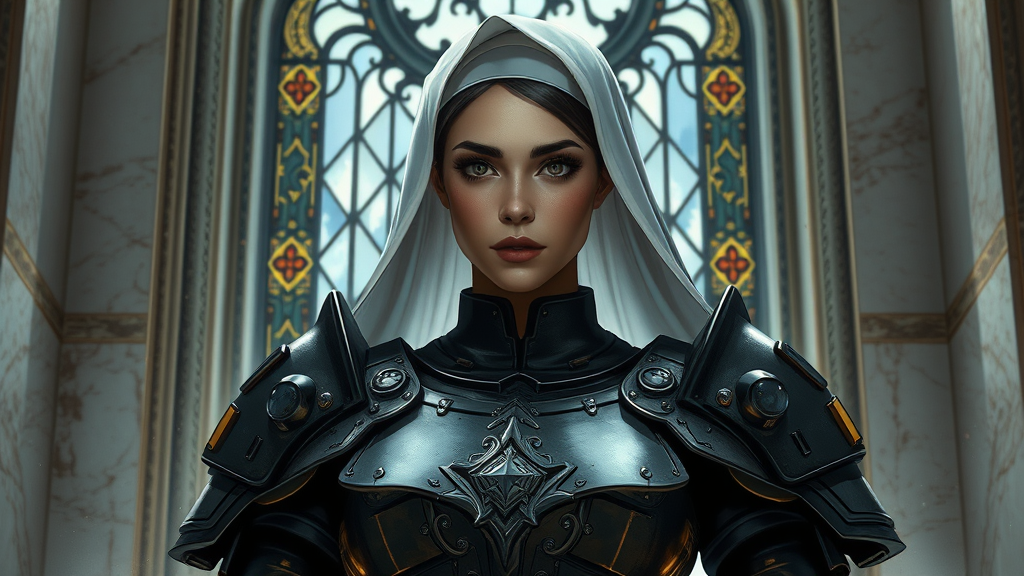 Create a full-body illustration of a devout Sister of Battle in an action scene, featuring a beautiful woman with sci-fi nun armor standing before a stained glass window. Her symmetrical face is detailed, with reflective eyes, dark eyebrows, and subtle makeup. The environment includes marble walls and dust particles, enhanced by intricate lighting effects such as rim lighting, dramatic lighting, and chiaroscuro from above. The scene is depicted in a professional majestic impressionistic style reminiscent of Waterhouse, John Constable, and the artistry of Studio Ghibli, Jeremy Mann, and Greg Manchess, capturing the essence of Warhammer 40k. The artwork should have the high detail and intrigue of trending pieces on ArtStation and CGSociety, with influences from Makoto Shinkai. The steel medieval armor is intricately detailed, and the scene embodies an epic, immersive atmosphere.