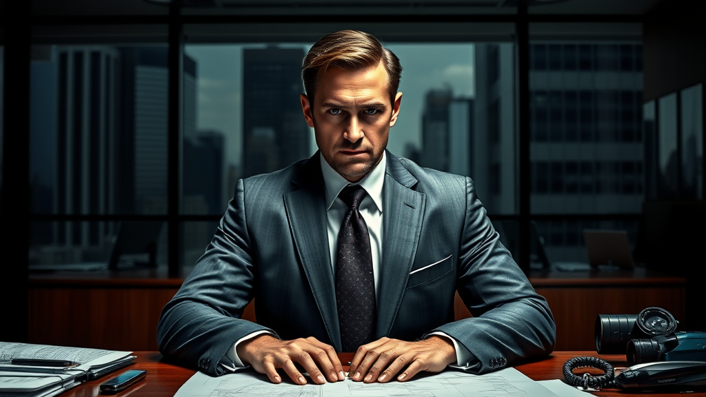Ironman dons a sleek, tailored suit, exuding the charisma of a top-tier executive, his determined gaze highlighted by dramatic lighting that casts dynamic shadows across a sleek city office. In this setting, he balances the burden of corporate power and technological innovation, his hands resting on a mahogany desk scattered with blueprints and high-tech gadgets, capturing the tension and ambition of a businessman reshaping the future.