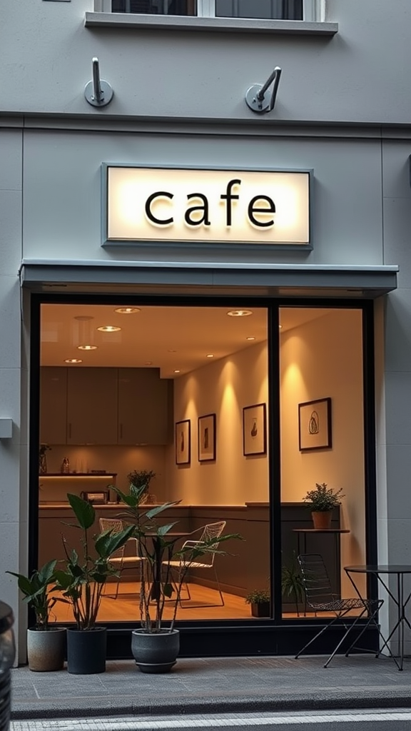A crisp and detailed image of a sleek cafe storefront, embodying the essence of modernism and minimalism with large glass windows and clean lines, subtle monochromatic color palette, a few potted plants artistically arranged along the entrance, minimalistic signage with a simple yet elegant logo, soft ambient lighting casting gentle shadows inside, a couple of chic outdoor metal chairs and tables, capturing a sense of calm sophistication and inviting atmosphere.