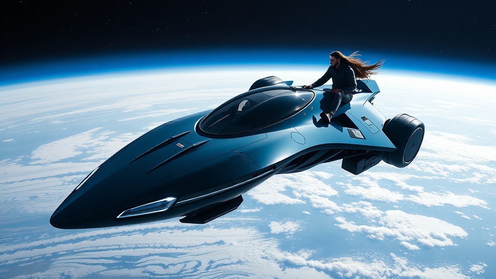 Photo of a futuristic dark blue spaceship in a weightless state, approaching a space station. The scene is set in space with a starry sky and Earth visible in the background. The composition features insane details and photorealism, captured in 8k resolution. The spaceship boasts a sleek, innovative design reminiscent of Ezequiel Montalt's car aesthetics. Two figures, resembling concept drafts of characters with a touch of Ironman influence, are seen nearby on a stylish motorbike. One figure has a distinctive long beard and pointed footwear, adding to the unique visual. The scene is dynamic and colorful, contrasting with the vast expanse of space and the subtle glow of distant celestial bodies. Despite creative mutations and unusual features, the overall composition remains intriguing and detailed, avoiding low quality and blemishes from artifacts or poorly rendered elements.