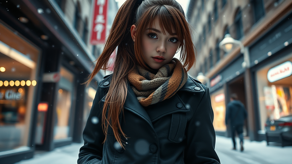 Cinematic shot with a focus from below capturing a dynamic pose and close-up of a stunning gothic girl. She stands in a snowy blizzard within a bustling city shopping district. Her long chestnut ponytail cascades over a leather army jacket paired with jeans and a cozy scarf. The scene is lit with volumetric lighting and global illumination highlighting reflections and creating a beautiful bokeh effect in the background. The photo achieves a studio color and realistic depiction, akin to professional work using 64K HD quality rendered in Unreal engine and octane render. The style is inspired by Makoto Shinkai's artistry.