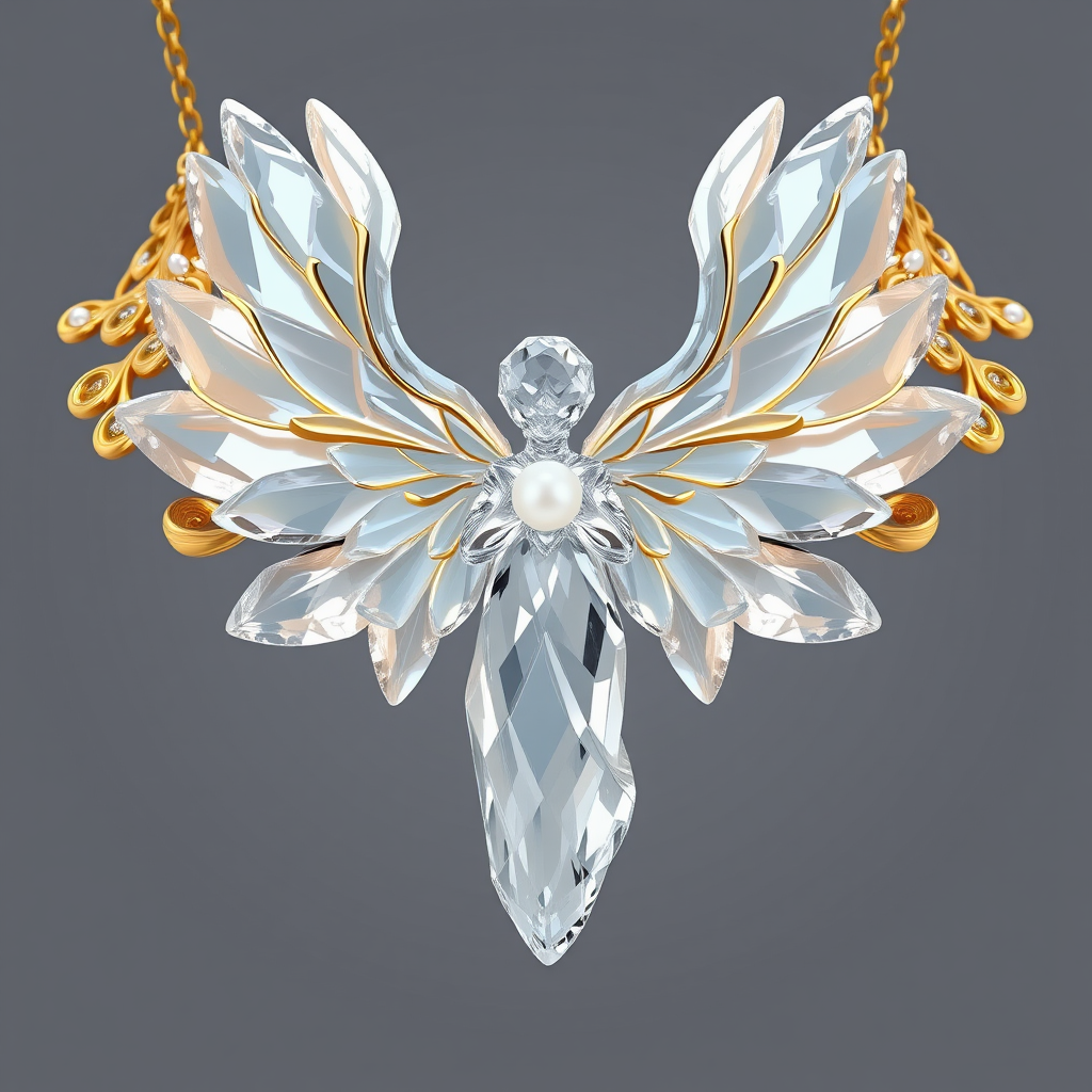 Dramatic gold and white gold collar style necklace featuring elegant large faceted ice crystal angel wings with intricate golden inlay, wrapping around the collar. A hyper-realistic ice crystal angel figure stands as the centerpiece, exquisitely designed with maximum detail. Encompassed by pearl accents and crystal quartz highlights, this piece captures the essence of an angelic form with an ethereal glow. The octane render showcases a clean and ultra-realistic close-up product view, with illumination lighting enhancing the luxurious and delicate craftsmanship. The final composition is a visually striking object photography piece, set against a seamless background, captured in a 32K resolution with a harmonious 9:16 aspect ratio.