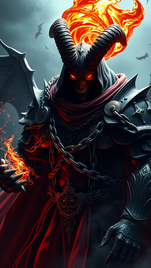 A menacing armored demon cloaked in black and crimson, wielding dark magic; his head is a swirling orb of fiery energy, radiating malevolence. His chain-linked armor gleams ominously under ethereal light, each link a testament to battles fought and victories won. Dark shadows dance around him, conjured by his command of the arcane. His presence is a fusion of otherworldly terror and regal authority, reminiscent of an ancient evil from mythical realms akin to Lord of the Rings and Dungeons and Dragons. Rendered in exquisite 4k ultra-realistic detail, as if birthed from the capabilities of the latest Unreal Engine, this dark sorcerer exudes fear and power, an embodiment of dark fantasy.