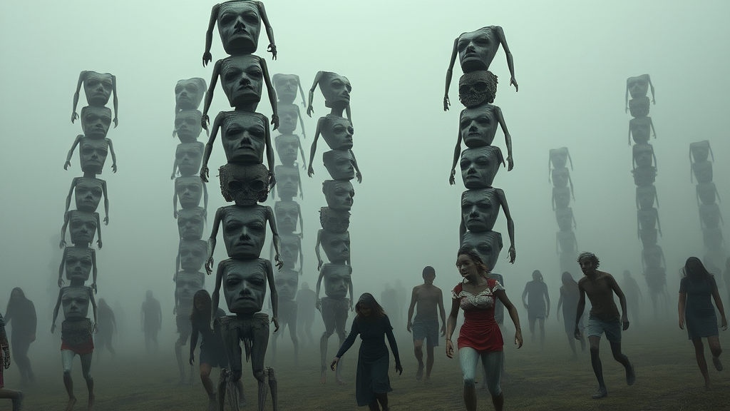 Alice traverses the twisted landscape of Zombieland, a surreal world conjured by Tim Burton, where stacked, mismatched torsos stand like morbid totem poles amidst a haze of gloomy fog. Figures with grotesquely distorted anatomies stagger around, some bearing extra limbs, others with limbs conspicuously absent, creating a landscape of floating, disconnected body parts. These bizarre inhabitants shuffle with mutated, nightmarish features, their appearances unsettling and ugly. Amidst the blurry edges of this eerie domain, signs of crude amputation and mutation manifest in every shadowy corner, merging the line between dream and nightmare, aesthetic and horror. Alice's journey unfolds within this bizarre carnival of the uncanny, each step deeper revealing layers of chaos and beauty intertwined.