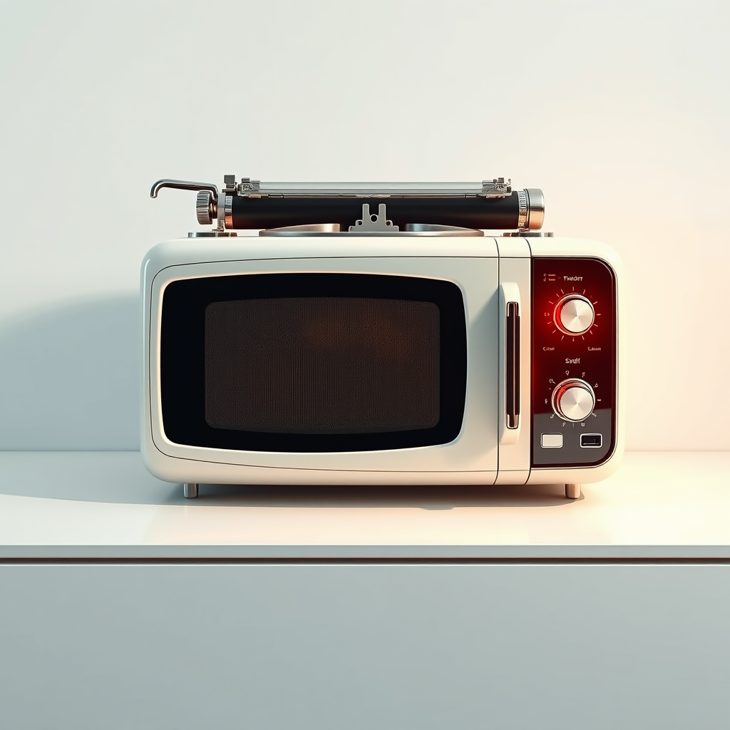 Imagine a microwave styled like a typewriter, featuring a retro-futuristic design inspired by the aesthetics of the 1950s and 60s. It is rendered in digital art with hyper-realistic and ultra-detailed elements, showcasing a fusion of classic charm and modern technology. The setting is a minimalist white background, emphasizing the appliance's intricate details and innovative form. The image is visually stunning, reminiscent of high-quality art station visuals, captured with the precision of an unreal engine. The scene is presented with a soft depth of field effect in a 1:1 aspect ratio, offering an immersive 8K experience.