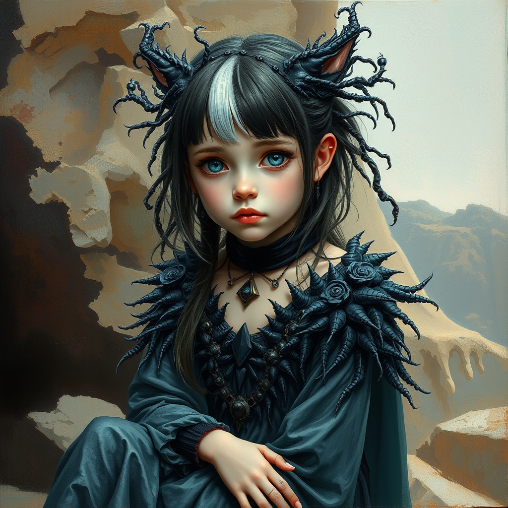 A young girl portrayed as a Greek priestess with streaked, two-tone hair styled to resemble plant tendrils, giving an appearance of coldness. She is set against the backdrop of the ancient Nahal Me’arot caves of Mount Carmel, a site of human evolution. Her aesthetic combines elements of cyber fairy grunge, sitting poised with ice-blue eyes that convey a gradient of emotions. She wears an elaborate, animal-themed costume with an iridescent black theme, reminiscent of a character from a one-piece universe, rich in intricate details. The scene is captured as an oil painting with an artful blend of unusual colors and a slightly surreal touch. The composition is enriched with elements that are intentionally offbeat and abstract, featuring exaggerated proportions and experimental forms, evoking a sense of avant-garde artistry reminiscent of a dream-like or altered state, drawing influence from digital art styles and portraying an imaginative, otherworldly visage.