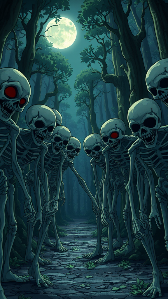 A chilling DVD screengrab from a Studio Ghibli-inspired film features a horde of zombies intricately designed by the imaginative Hayao Miyazaki. Each undead character exudes the unique charm and wonder typical of retro anime, with a tinge of horror that transforms whimsical details into haunting features. The scene is set in a mysterious, overgrown forest with moonlight casting eerie shadows on the ground, highlighting the delicate balance between beauty and fear characteristic of this fantastical world.