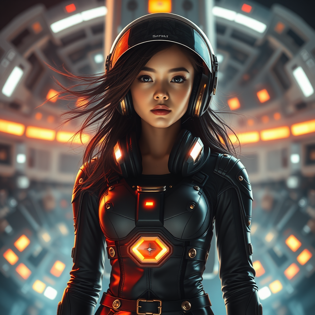 A captivating and exquisitely attractive girl in a fitted spacesuit stands against the backdrop of a gigantic, hyper-detailed, minimalist sci-fi spaceship, inspired by the Tsutomu Nihei and Sidonia no Kishi aesthetic. The scene is illuminated with cinematic lighting that accentuates her dynamically flowing hair and highlights her glowing chest piece. Her attire includes a helmet, stylish piercings, vibrant lights, and chic headphones over a bare neck. Although slender with narrow hips, she projects confidence in her sleek, gold-accented outfit, adorned with precise rivets. The composition is strikingly symmetrical, focusing on her poised figure with perfectly proportioned features, ensuring clarity and quality. The lighting creates an impressive, almost theatrical ambiance, emphasizing her striking presence against the cosmic setting.