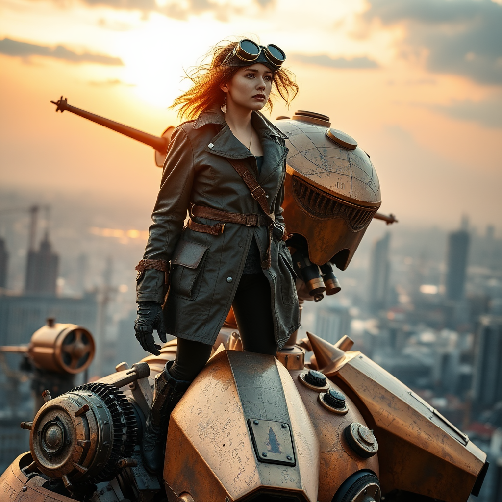A steampunk mecha pilot stands proudly on the shoulder of her intricately designed mecha. The towering machine, with gears and steam visibly hissing from its joints, stands against a backdrop of an industrial cityscape. The pilot, wearing goggles and a weathered leather coat, surveys the landscape with awe and determination. The bronze and copper hues of the mecha glisten under the setting sun, casting a warm glow that highlights the intricate craftsmanship and artistry of its construction. Her hair is tousled by the gentle breeze, and a feeling of triumph and admiration fills the air as she takes in the breathtaking view.