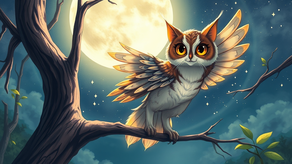 A whimsical creature featuring the graceful elegance of an owl blended with the playful demeanor of a cat, the owl cat displays intricate, feather-like fur that shimmers under soft moonlight. Its large, expressive eyes are a captivating hybrid of feline curiosity and avian wisdom. In this enchanting concept art, the owl cat is depicted in an animated, lively pose, balancing on a slender tree branch under a starlit sky. The vibrant scene is painted with expressive strokes, capturing both the mystical allure of an anime-style portrait and the dynamic energy of a full-body depiction, achieved through a stylish, expressive narrative within a magical forest realm.
