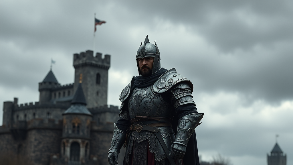 A regal figure clad in intricately detailed armor stands tall, exuding an aura of strength and authority. The scene is enveloped in a mesmerizing dark fantasy ambiance, with an overcast sky casting a somber gray hue. The composition is perfectly symmetrical, centered on the figure, highlighting the precise craftsmanship of medieval artistry. Behind them, an imposing fortress looms, its towering battlements adding to the sense of grandeur. The digital art captures every subtle nuance in ultra high quality, from the textures of the armor to the muted shadows that dance across the landscape, creating a timeless and evocative image.