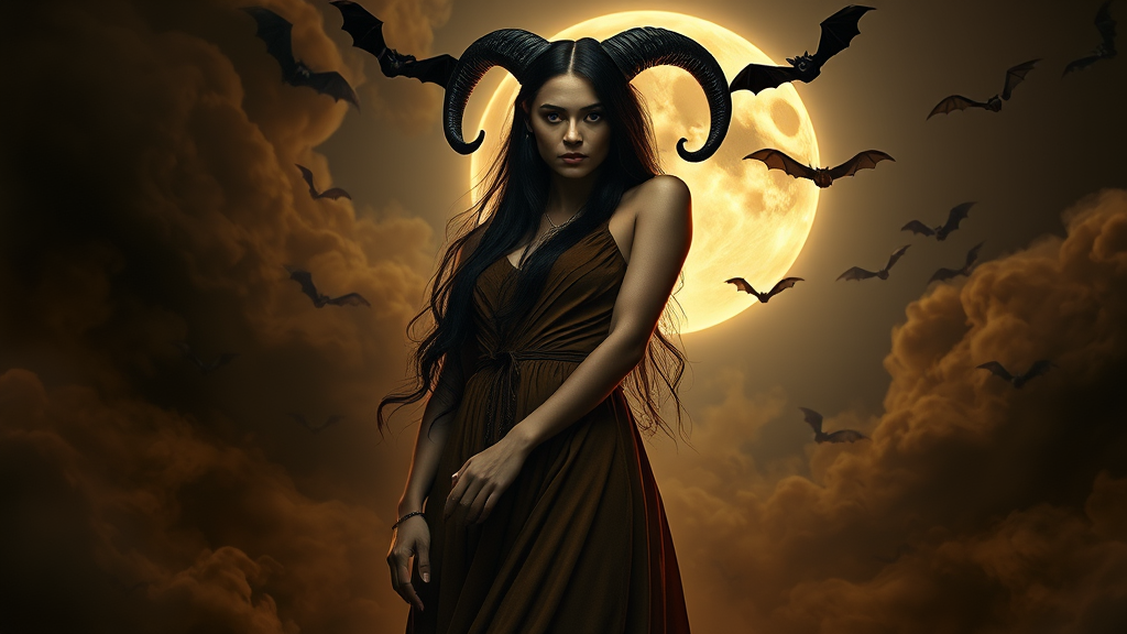 A mysterious woman with long, flowing dark hair and elegant, twisted horns stands confidently in a rich, earth-toned dress that perfectly complements her enigmatic features. The background is a swirling tapestry of dark smoke, with ominous bats circling around her, enhancing the eerie, otherworldly ambiance. Dim lighting casts shadows across her face, while a radiant full moon behind her creates a halo of ethereal glow, illuminating her with a mystical aura. The scene is captured from a low, upward angle, emphasizing her commanding presence and dominance. The fantasy art style is vividly alive with dramatic contrasts and vibrant hues, as if captured through the lens of a high-end digital SLR or mirrorless camera, using a wide-angle lens to encompass the vast, atmospheric setting.