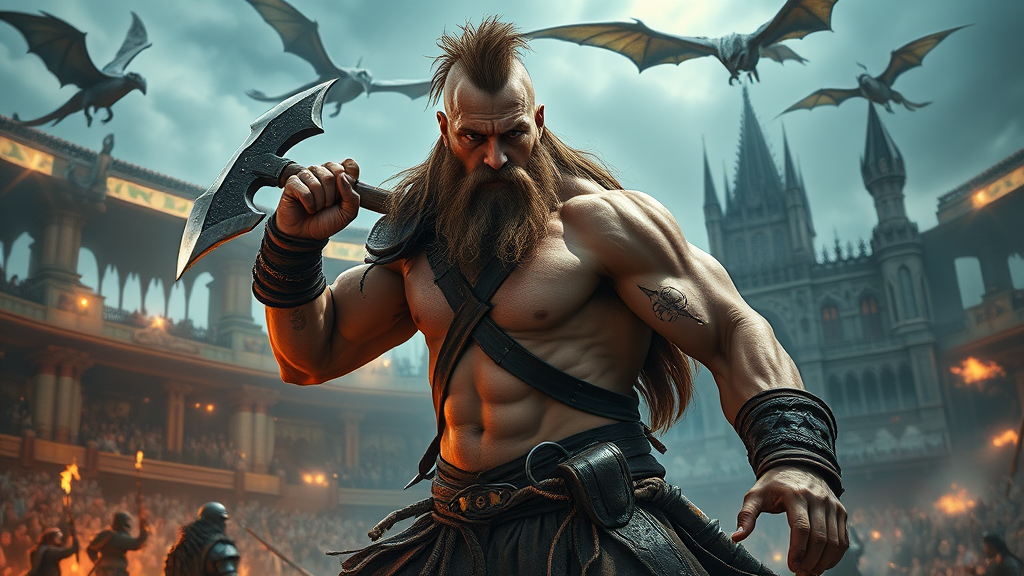 Detailed cinematic lighting in UHD, featuring a full-body character portrait of a barbarian gladiator wielding a battle axe. The scene captures his extreme muscles, rugged and tattered appearance, within an intricate and dramatic arena setting. Magic pulses in the air with dragons soaring above, elves watching from the sidelines, and majestic castles in the background. The atmosphere blends a fantasy theme with subtle hints of modernity, inspired by the works of Donato Giancola, Ruan Jia, Kekai Kotaki, Magali Villeneuve, and Even Mehl Amundsen. The composition excludes negative influence, focusing on a blend of mythic and contemporary elements.