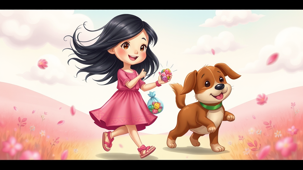 A whimsical children's book scene featuring a cheerful young girl with flowing black hair in a vibrant pink dress and matching sandals, strolling through a pastel-colored world alongside her playful pet dog with glossy brown fur. Her eyes twinkle with excitement as she holds a colorful bag of candies, and gentle 2D illustrations capture the joyful moment. The landscape around them is dotted with soft, dreamy hues, and fluffy clouds float overhead, adding to the enchanting atmosphere.