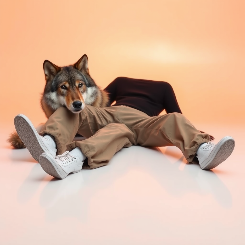 A wolf lounges effortlessly on a sleek white surface, dressed in a sophisticated, form-fitting black turtleneck. Its laid-back posture draws attention to loose-fitting khaki pants paired with clean white sneakers. The backdrop radiates a gentle orange glow, creating a striking contrast that amplifies the dreamlike atmosphere. This fusion of street style and untamed nature captures the wolf's enigmatic expression and aura.