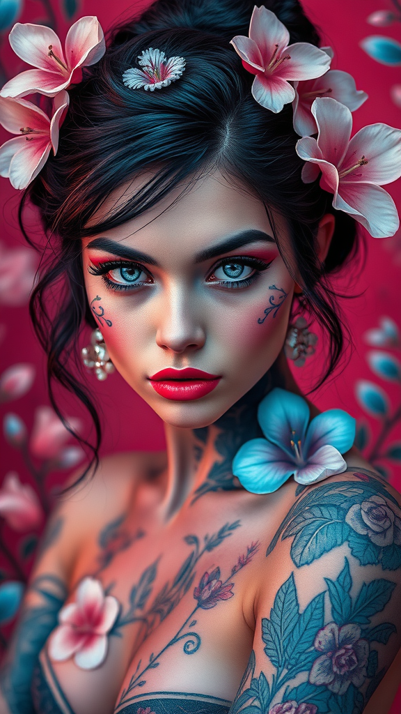 A futuristic fantasy portrait of a tattoo artist adorned with vibrant blue tattoos and delicate flowers on her skin. Her intense gaze pierces through a world painted in oil portraitures, blending the light red and teal hues. This high-resolution image captures the essence of rococo elegance with a dark and explosive twist. The tattooed artist poses confidently in a digital manipulation style reminiscent of Tanya Shatseva and Daniel F. Gerhartz. Dark pink and light blue tones create a vivid contrast, weaving intricate imagery throughout the scene. This UHD oil portrait captures the intricate balance between classical beauty and modern creativity, offering a mesmerizing view of a tattooed muse in an avant-garde setting.