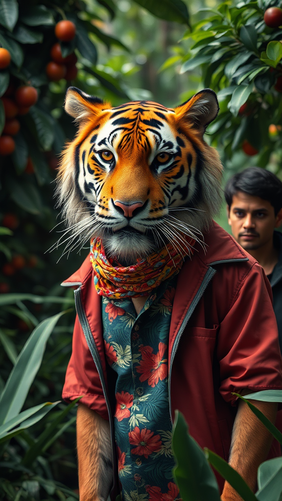 A tiger sporting a vibrant jacket and scarf over a Hawaiian floral shirt stands in a dense jungle setting, surrounded by lush greenery. Nearby, a man in a stylish jacket appears, reminiscent of Christian W. Staudinger's work. The scene captures an animal photography essence fit for an album cover, showcasing a maximalist style with bold eyeliner reminiscent of fking_scifi. It evokes the fantastical style of L. Frank Baum against a vivid fruit-laden backdrop, presented in a panoramic view. The scene is shot with a cinematic 16mm camera, color graded to emulate Portra 400 film, highlighting remarkable, realistic colors. The tiger's skin is ultra-realistic, with detailed textures and pupils, and subtly shows skin noise, fuzz, and dryness. This RAW candid cinematic moment is captured without visual flaws or distortions, avoiding bland or exaggerated caricatures, focusing instead on high-quality artistic expression.