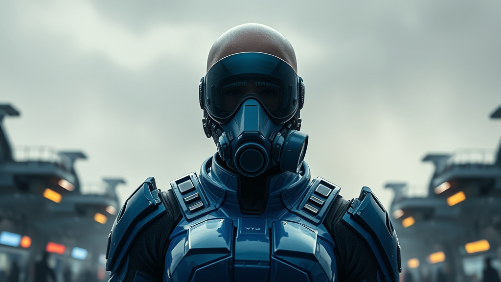 A formidable female figure in a sleek blue sci-fi spacesuit stands defiantly on a bustling spaceport, silhouetted against a backdrop of hovering futuristic platforms in an overcast atmosphere. Her face is obscured by a sci-fi mask with an intricate visor and lens, complemented by a high-tech respirator. Her bald head reflects the ambient light, and her plate armor and isolated armor pieces gleam with intricate detailing. Captured from a dramatic third-person view from below, the scene is rich in the fine details characteristic of a sci-fi movie style. This photorealistic composition utilizes natural textures and lighting, enhanced by subtle natural blur and moody, cinematic lighting. The image benefits from cinematic rendering and ray tracing for maximum realism, presented in 8K Ultra-HD.